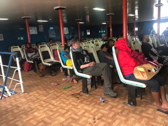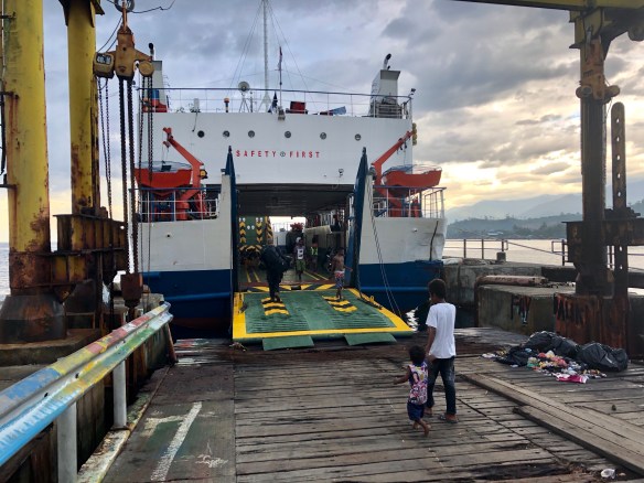 Logistiek was dit deel van de reis een grote puzzel die we vooraf moesten leggen, met name het bezoek aan Numfor: We starten met twee korte nachtvluchten vanaf Jakarta naar Manokwari (via Makassar). Als we ‘s morgens aankomen zijn we flink gaar maar is het gelukkig maar een klein stukje naar de haven. Hier vertrekt eens per week de ferry naar Numfor. Het is een aftandse smerige boot die uren te laat vertrekt en heel langzaam vaart waardoor we pas in het donker op Numfor aankomen.