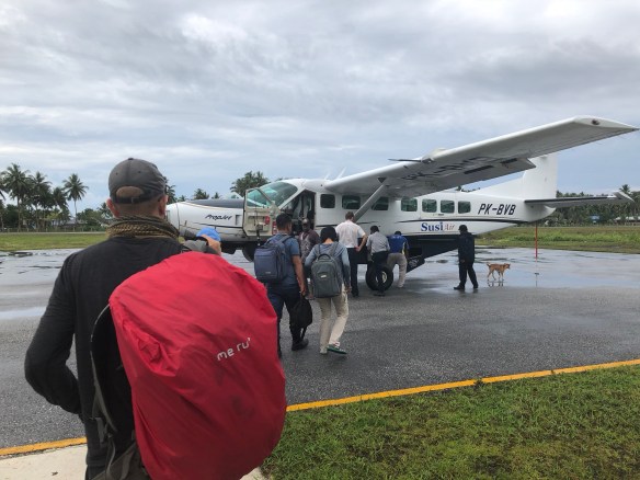 We verlaten Numfor de volgende ochtend via de lucht naar Biak met een kleine 12-seater van Susi Air. Deze lokale maatschappij verbindt met kleine vliegtuigjes kleine vliegvelden binnen Indonesië en biedt voor veel afgelegen plekken de enige vliegmogelijkheid. Het vliegschema is niet online verkrijgbaar en kaartjes zijn alleen te reserveren door vooraf naar Numfor te bellen (in het Bahasa) waarna je met de hand in het schriftje wordt geschreven. We zijn dan ook blij en opgelucht als op de ochtend van vertrekt een vliegtuigje blijkt te gaan en onze namen in het schriftje staan. Het is ook voor het eerst dat we een ticket contant afrekenen aan de balie en zelf op de weegschaal moeten. Wel heel gaaf om vervolgens over de schouders van de piloot mee te kijken als we van het ene tropische eiland naar het volgende hoppen.