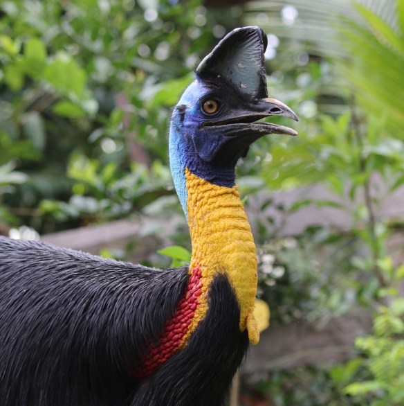 Die Cockatoo kunnen we nog wel op een afstandje houden maar als even later ook een Northern Cassowary verschijnt gaan we maar snel achter de reling van ons hutje staan. Deze dino komt af en toe uit het bos om een extra maaltje bananen te ontvangen en is duidelijk niet bang voor mensen (eerder andersom). Op een veilige afstand kunnen we deze doorgaans hele moeilijke soort goed bekijken, al blijft het een raar gezicht om dit bakbeest van 1.5 meter hoog tussen de houten hutjes te zien lopen.
