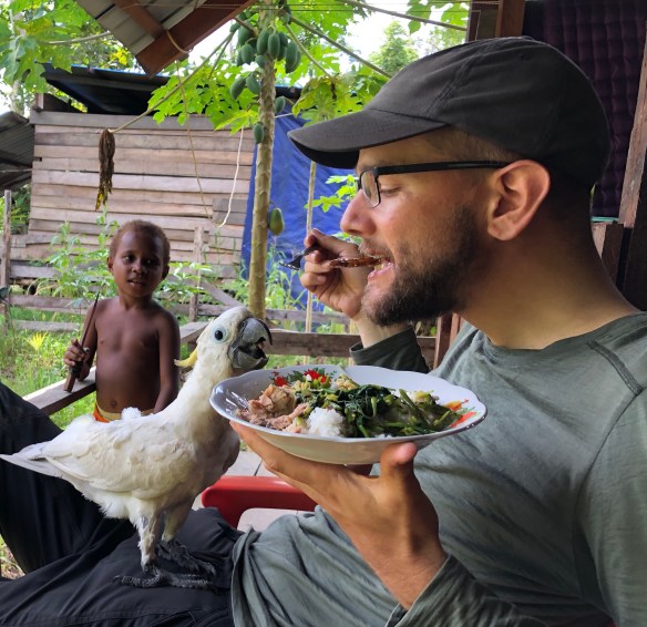 Eenmaal in het dorp worden we heel gastvrij ontvangen door alle dorpelingen en installeren we ons in een simpel houten hutje. De vriendelijkheid naar de vogels rond het dorp heeft er inmiddels ook voor gezorgd dat er aantal vogelvrienden gevoerd worden. Tijdens de lunch wordt al snel duidelijk hoe de plaatselijke Cockatoo en Hornbill daarover denken.