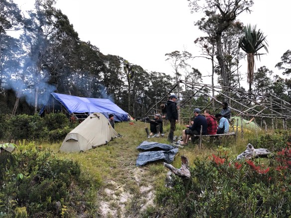 Het letterlijke hoogtepunt komt op dag 2 en 3 als we een trekking maken naar Mount Trikora voor de Snow Mountain Robin. We vertrekken met het eerste licht en klimmen en dalen de hele dag door een uitgestrekt en ruig landschap. Het pad is heel modderig en onze laarzen zakken vaak diep weg (bij Rob zelfs een keer tot zijn bovenbeen). Eindpunt van deze dag is een grot op bijna 3900m waar onze tentjes precies naast elkaar passen op de smalle richel. Gelukkig maken de porters een “api besar” (groot vuur) waar we allemaal dicht omheen kruipen.