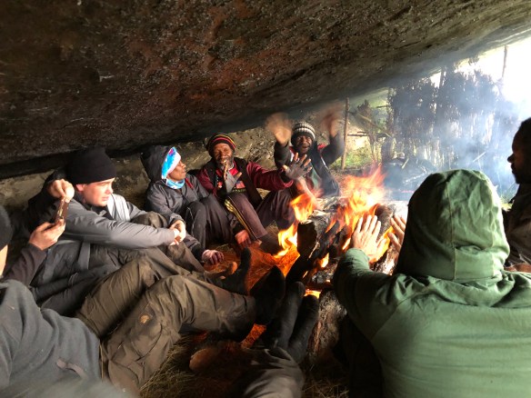 Ons eerste kamp is op 3300m op een hoogvlakte waar we onze tentjes opzetten naast de kooktent. Deze bestaat uit een houten constructie met een zeil erover waaronder op een (nat) houtvuur voor ons wordt gekookt. Terwijl het buiten begint te regenen is het ondanks de rook best behaaglijk met z’n allen rond het vuur.