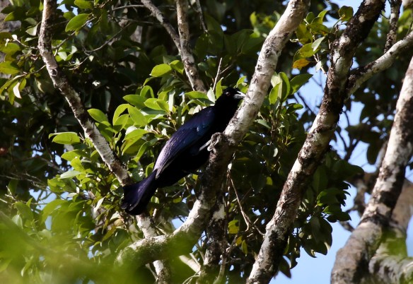 Het goede nieuws voor ons is dat we tussen alle gelddiscussies door wel de vogels zien (daar gaat het uiteindelijk om!) zodat we na 2 dagen gelukkig zo’n beetje klaar zijn in het bos en niet nog meer hoeven te regelen/betalen. Na de Manus Boobook (een endemisch uiltje) op de eerste middag komt het absolute hoogtepunt op de 2e ochtend als na een flink eind zoeken een Pitta reageert en terugroept. De tweede keer roept hij al dichterbij en niet veel later zit hij boven ons in de boom. Niet alleen heel erg zeldzaam en moeilijk maar ook nog heel mooi; met een diep zwart lichaam, rode buik en felle lichtblauwe vleugels die hij bij elke roep naar beneden pompt.