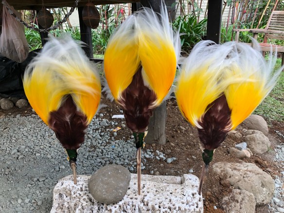 De traditionele outfits voor dansen en vechten zijn duidelijk afgekeken van de lokale vogels. Tijdens ons verblijf zien we een flink aantal Birds of Paradise (deels oude vrienden uit West Papua) die laten zien hoe je de show kan stelen met een mooi verenkleed. Op de eerste dag begint het met de imposante Brown Sicklebill (meer dan een meter lang) en de King of Saxony, een kleine gele vogel die zijn lengte meer dan goed maakt met twee enorme antennes die vanuit hoorntjes op zijn hoofd groeien.