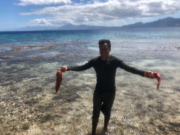Na een rondje vogelen nemen we een duik in de glasheldere zee om de onderwaterwereld te ontdekken. Fantastisch mooi koraal met een eindeloze variatie aan kleurige, tropische vissen. Twee daarvan worden gevangen en even later lunchen we met vers gebakken vis op dit paradijselijke strandje. Can life get any better?