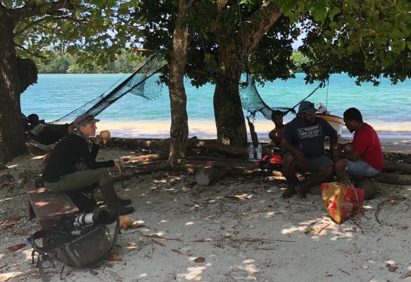 Eenmaal op het eiland worden we rondgeleid door de schoonzoon van de “island chief” terwijl Mark de koekjes en koffie uitdeelt die we als vriendschap token hebben meegenomen. Er wonen 150 mensen op Tong, volledig zelfvoorzienend met verse vis en het groeien van palmharten, casave en kokosnoten. De Manus Fantail (en een aantal andere goede eiland soorten) zijn snel gevonden waarna we met een verse kokosnoot als drankje afwachten hoe er door Mark en de lokale belangrijke mannen wordt bediscussieerd hoe onze geldbijdrage voor het land verdeeld moet worden.
