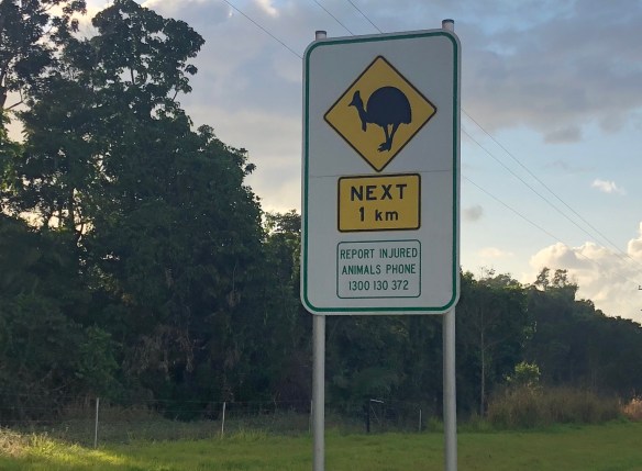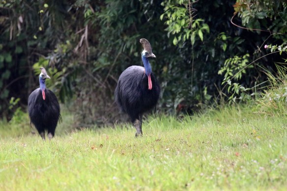 Toch is het na een uurtje rijden en zoeken in het eerste licht raak; in de berm van de doorgaande weg loopt een paartje Cassowary die niet bepaald schuw zijn. Wat een indrukwekkende dieren! Even later steekt er eentje over waarvoor 3 passerende auto’s keurig afremmen alsof het een alledaagse gebeurtenis is …