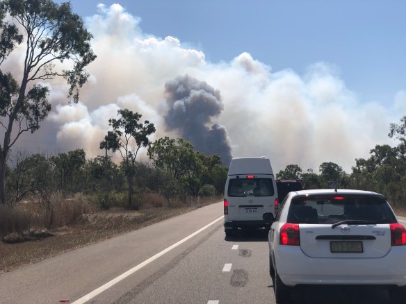 De afstanden zijn groot dus het betekent naast lekker vogels kijken ook heel veel uren in de auto zitten. Het is in Australië het begin van de lente maar als we omhoog rijden is het duidelijk dat een groot deel van de staat Queensland vooral een tropisch droog versus nat seizoen heeft en het nu heel droog is. Al in de eerste dagen zien we meerdere bosbranden en staan we ruim 2 uur in de file als een grote vlammenzee de snelweg oversteekt. De Australian Bustard, die normaal gesproken een lichte nek en buik heeft, lijkt door alle zwarte as haast een andere soort.