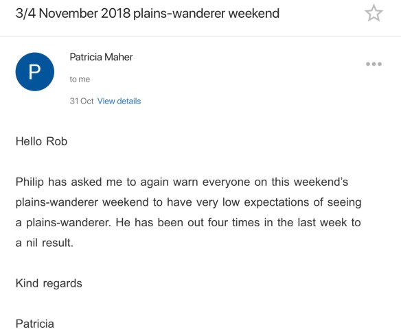 Normaal gesproken vinden we het het leukst om zelf de vogels te zoeken maar dat is in dit geval een onmogelijke opgave. Er is maar één man in Australië die weet waar je ze kunt vinden en dat is Phil; half cowbow, half vogelfanaat houdt Phil zich al sinds 1980 bezig met het opsporen van Plains Wanderers waarvoor hij er meerdere nachten per week op uit trekt. Al vanuit huis boeken we een plekje op een van zijn weekend tours vanuit Deniliquin maar de droogte waar we eerder al last blijkt alleen ook hier van grote invloed te zijn…