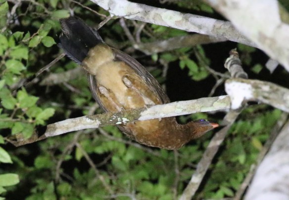 Uitkijkend over het bos zien we de zon ondergaan en gaan langzaam alle vogels slapen. Maar de belangrijkste zoektocht van vandaag moet nog beginnen; de zoektocht naar de Nocturnal Curassow. Deze grote vogels zijn de enige van hun familie die ‘s nachts boven in de boomtoppen klimmen en vanuit daar hun diepe zang door het bos laten klinken. Overdag zijn ze niet te vinden, dus de enige manier om ze te zien is om ze ‘s nachts op te sporen. Even na acht uur is het zover en horen we meerdere Curassows hun lied starten. In de totale duisternis van het bos is dit een van de meest magische geluiden die er is.