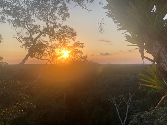 Het is nog erg heet en stil als we ‘s middags omhoog klimmen en ons installeren op het hoogste platform (35 meter boven de grond).
