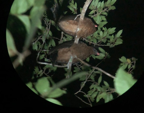 We gaan op een boomstam zitten en wachten, eindeloos wachten: het is pikdonker, warm en drukkend en er zijn overal muggen. Om ons heen klinken geluiden van insecten en kikkers en af toe een verre uil maar de Curassow blijft stil. Als het tien uur is en we al bijna 2 uur zo zitten begint de hoop langzaam weg te zakken. Nog een half uur, stelt onze gids voor. Na 20 min hebben we allemaal de hoop een beetje verloren (of zijn niet bereid nog uren in het bos te zitten) en lopen we terug. We zijn nog geen 100 meter op weg als opeens de Curassows weer beginnen te zingen. We zijn dichtbij en zo snel mogelijk banen we een weg door de begroeiing. De spanning stijgt maar dan seint onze gids dat hij m heeft. Het blijkt niet één maar zelfs twee vogels te zijn, hoog boven ons in de top van de boom maar met de telescoop goed te bekijken.