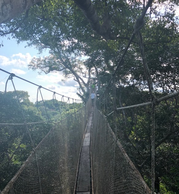 Een van de lodges die we bezoeken heeft een canopy walkway: een constructie van 14 houten platforms op verschillende hoogtes met daartussen hangbruggen. Dit is een ideale gelegenheid om soorten te kunnen zien die alleen maar in de boomkruinen leven.