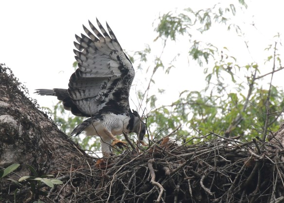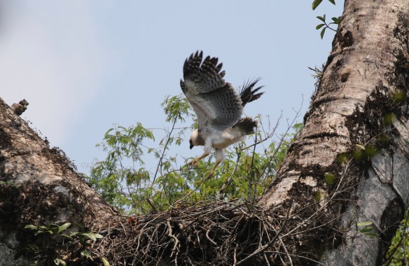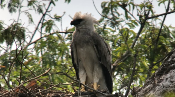 Na een boottocht vanaf het eind van de asfaltweg, een stuk met een jeep en een stuk lopen kamperen we de eerste nacht in het Nationale Park. Uit voorzorg zetten we ons tentje onder een overkapping maar de gigantische onweersbui van de avond ervoor blijft uit (april is hier de start van het regenseizoen dus elke dag weer hopen dat het droog blijft!). Die middag zien we als voorproefje al een Crested Eagle op een nest, het kleinere broertje van de Harpy.