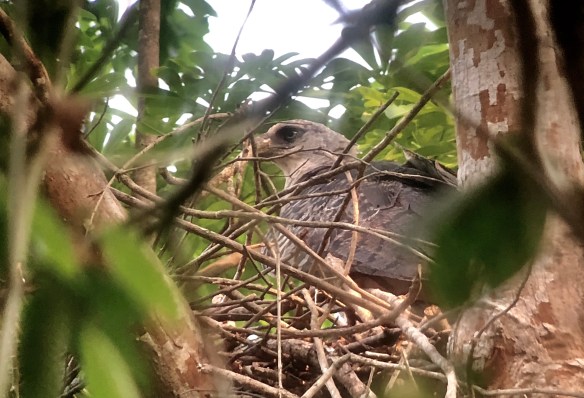 De volgende ochtend is het zo ver en gaan we in de schemer op weg naar het nest. Harpy’s gebruiken hiervoor altijd hoge bomen met een grote vork in de takken, en als we aankomen is het meteen duidelijk dat ze hier zo’n mooie boom gevonden hebben. Met het blote oog zien we de jonge vogel zitten; een baby Harpy van nu bijna 6 maanden oud die nog niet kan vliegen maar wel al indrukkend groot is.