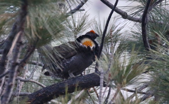 Hoogtepunt in de bergen zijn twee soorten hoenders; Sooty Grouse en Sage Grouse die we beiden spectaculair zien baltsen. Als eerste gaan we op zoek naar de Sooty Grouse aan het einde van een dal waar nog volop sneeuw ligt. In de vroege ochtend en late middag roepen de mannetjes Grouses hier vanuit hoog in de boom. De uitdaging is alleen om er eentje te vinden aangezien de lage klank maar met moeite over het geluid van de wind en het riviertje uitkomt. Op de valreep in de schemer komt Sjoerd met het goede nieuws dat hij er eentje heeft gehoord en even later staan we naar een prachtige Sooty Grouse te kijken. Het meest bizarre is een stuk gele kale nekhuid die normaal wordt bedekt onder veren maar die tijdens het baltsen vol wordt geshowd.