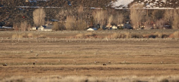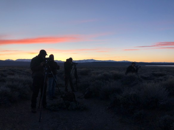 Met de schemer zijn we op de plek en kunnen we in de verte al de kleine stipjes zien staan op de vlakte. Door de telescoop veranderen de stipjes in tientallen mannetjes Sage Grouse die op deze plek de strijd met elkaar aan gaan om de mooiste baltsdans te laten zien.